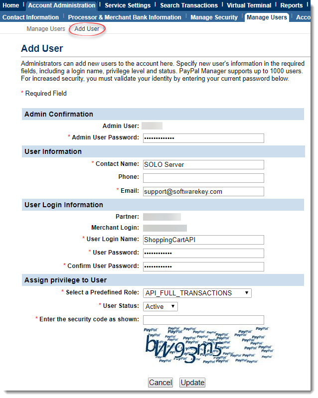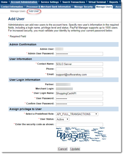 For a PayPal Payments Pro (PayFlow Edition) account, you will need to provide new user credentials so we may submit transactions to your PayPal Pro account. To create the new user for use with the shopping cart, please follow the steps below: