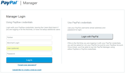 - Log into PayPal Manager at https://manager.paypal.com/ using the primary administrator account (if you created additional user accounts in PayPal Manager, make sure the optional User field is blank).