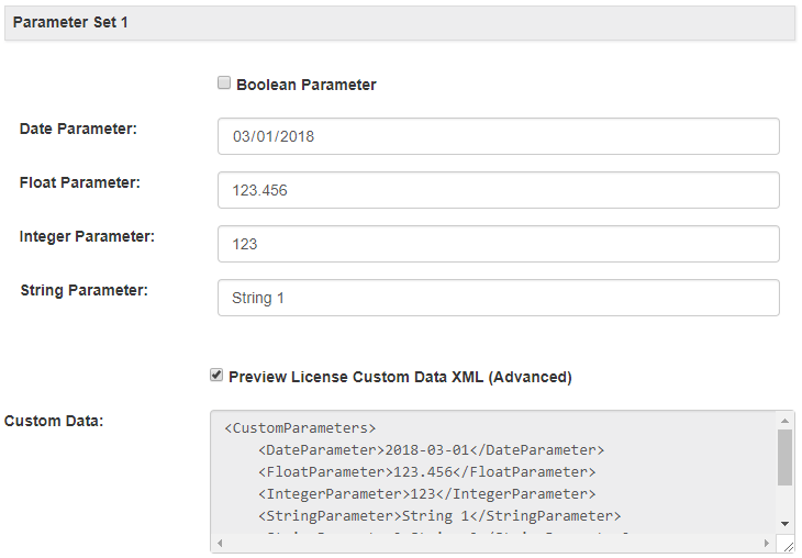 - When adding or editing licenses for product options which are associated with a custom parameter set, form fields for setting the custom parameters will be displayed. When saving, the custom parameter data is then serialized to XML and stored on the License Custom Data field on the license (note that this is separate from the Custom Data fields on the product and product option). This field is included in the Protection PLUS 5 SDK license file, allowing it to be used in your application for any purpose.