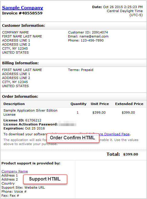 For each item within the invoice, the Product Order Confirm HTML is displayed first, and then the Option Order Confirm HTML is displayed next. Default text is used if these fields are left blank. To access these fields: